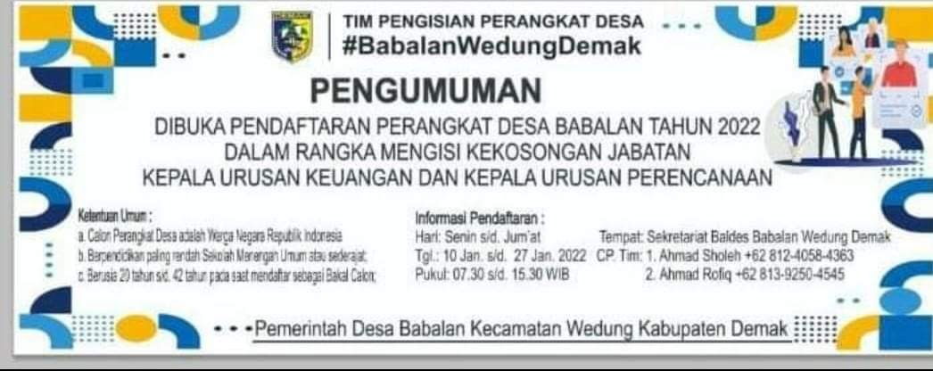 Desa Babalan Wedung Buka Pendaftaran Dua Jabata... DEMAK – Pemerintah Desa Babalan Kecamatan Wedung membuka pendaftaran pe... 2022-01-05 13:09:39 Read More