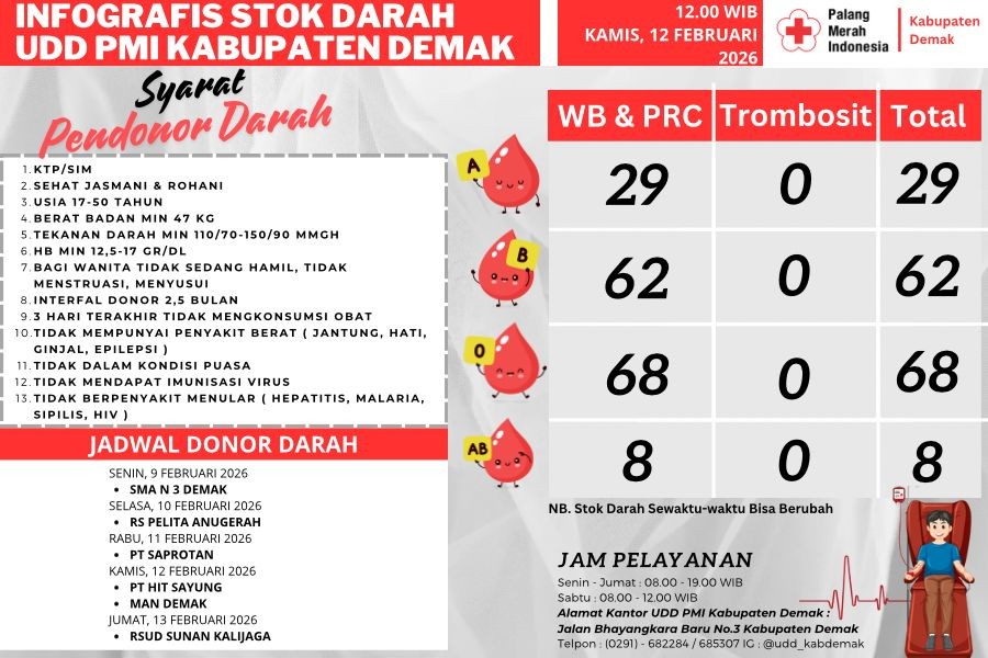 Stok Darah UDD PMI Demak Per Tanggal 12 Februar... DEMAK - Unit Donor Darah (UDD) Palang Merah Indonesia (PMI) Kabupaten Demak m... 2026-02-13 08:28:33 Read More