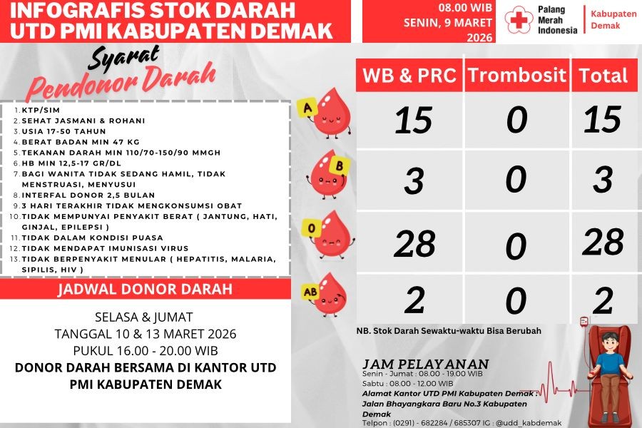 Stok Darah Menipis, PMI Ajak Partisipasi Pendon... DEMAK – Palang Merah Indonesia (PMI) Kabupaten Demak menginformasikan b... 2026-03-09 14:08:03 Read More