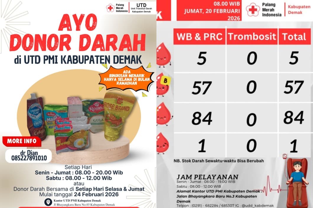 UTD PMI Kabupaten Demak Ajak Masyarakat Donor D... DEMAK - Unit Transfusi Darah (UTD) Palang Merah Indonesia (PMI) Kabupaten Dem... 2026-02-23 09:12:16 Read More