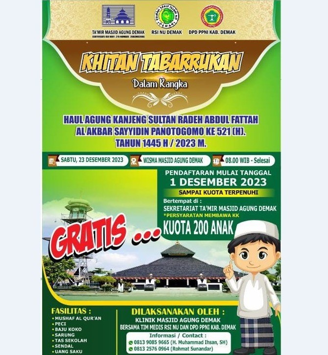 Khitan Tabarrukan Gratis Sambut Haul Agung Kanj... DEMAK – Menjelang Haul Agung Kanjeng Sultan Raden Abdul Fattah Al Akbar... 2023-11-17 10:45:39 Read More