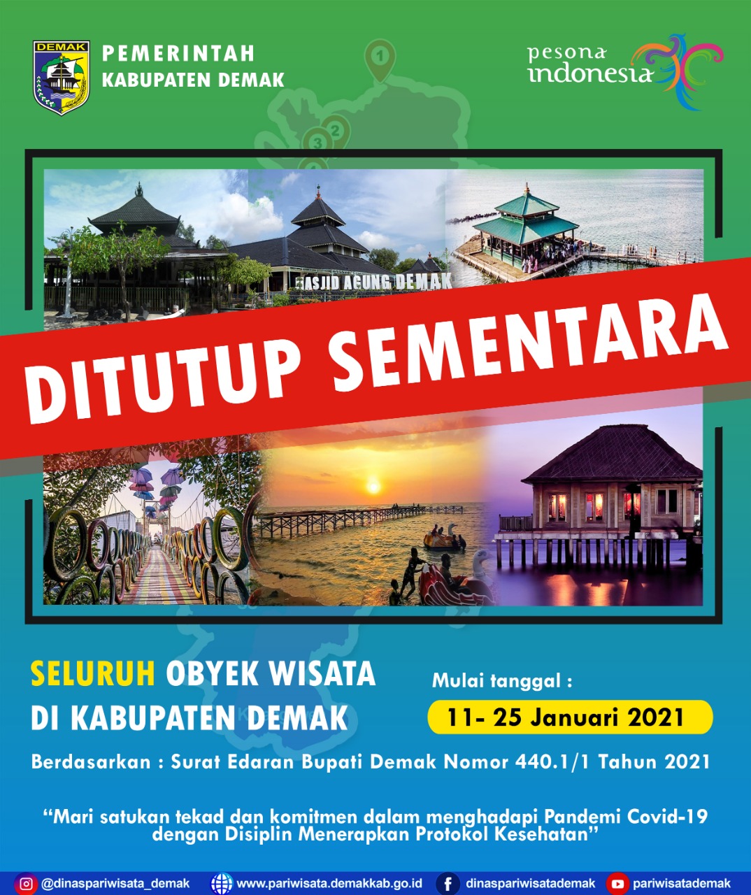 Dinas Pariwisata Menutup Sementara Destinasi Wi... DEMAK – Sehubungan dengan Surat Edaran Bupati nomor 440.1/1 Tahun 2021... 2021-01-13 08:00:28 Read More
