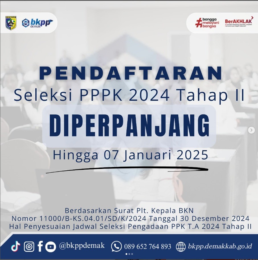 Pendaftaran Seleksi PPPK 2024 Tahap II Kabupate... DEMAK - Pemerintah Kabupaten Demak melalui Badan Kepegawaian Pendidikan dan P... 2024-12-31 10:50:08 Read More