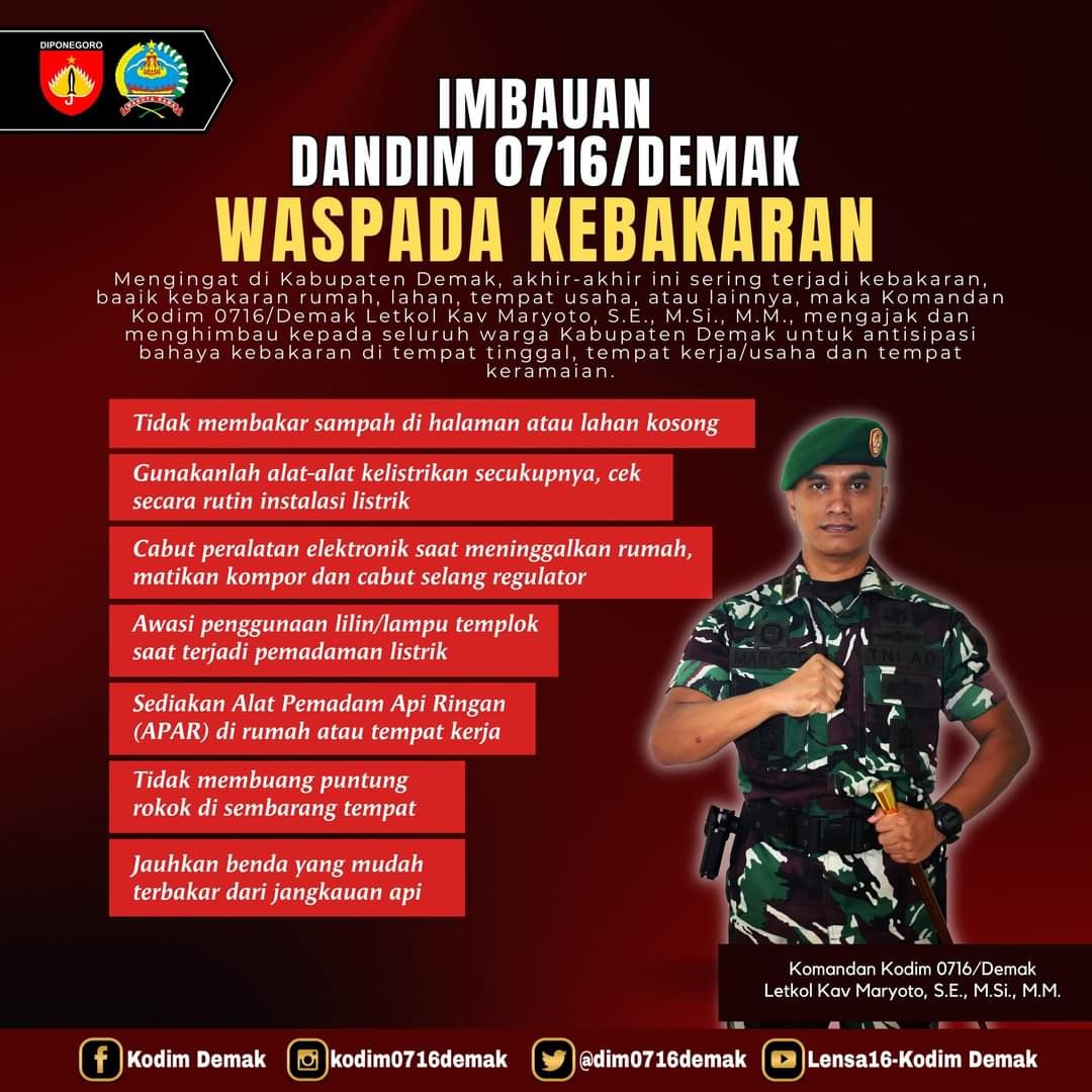 Dandim 0716/Demak Berikan Himbauan Waspada Keba... DEMAK - Menyikapi meningkatnya jumlah kasus kebakaran di wilayah Kabupaten De... 2024-09-03 14:40:12 Read More