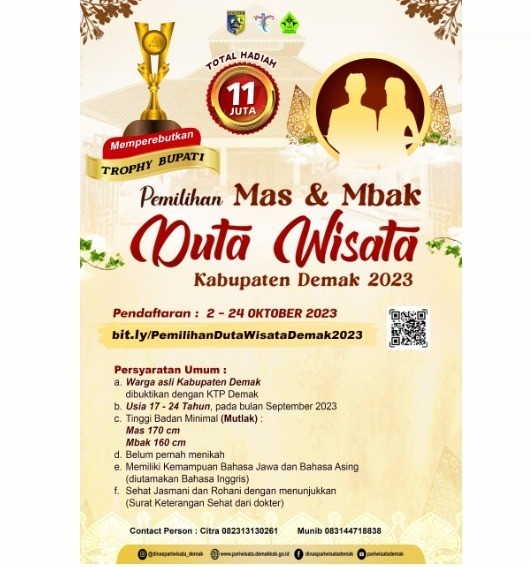 Pendaftaran Mas dan Mbak Duta Wisata Kabupaten... DEMAK – Kesempatan terbuka lebar bagi muda-mudi asli Kabupaten Demak ya... 2023-10-10 13:07:01 Read More